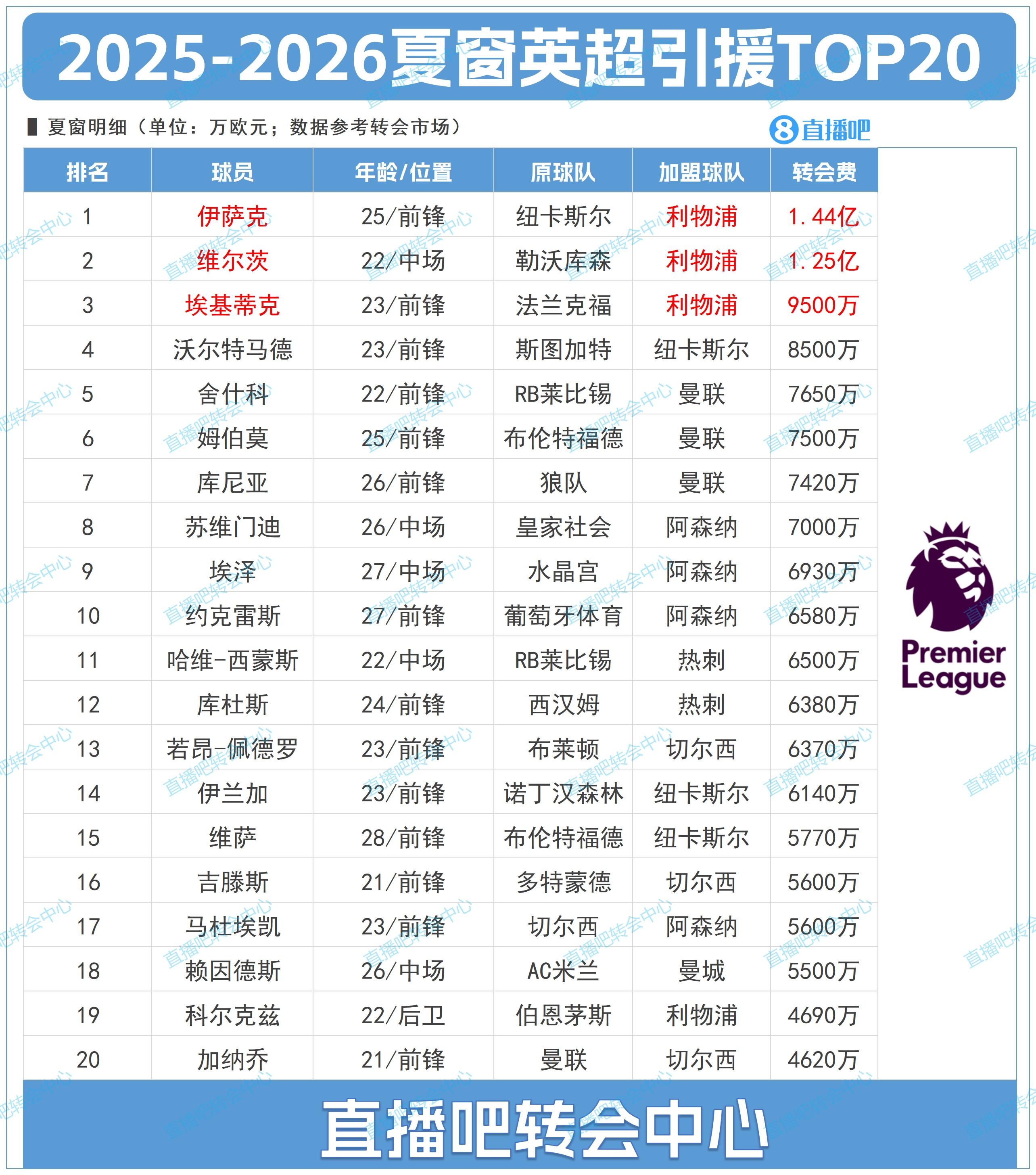 9月3日,25/26赛季夏季转会窗正式关闭,The Athletic对英超20支球队的转会操作进行了评级。利物浦获得A,阿森纳A-,切尔西、曼联和热刺均获B,曼城则被评为B-。