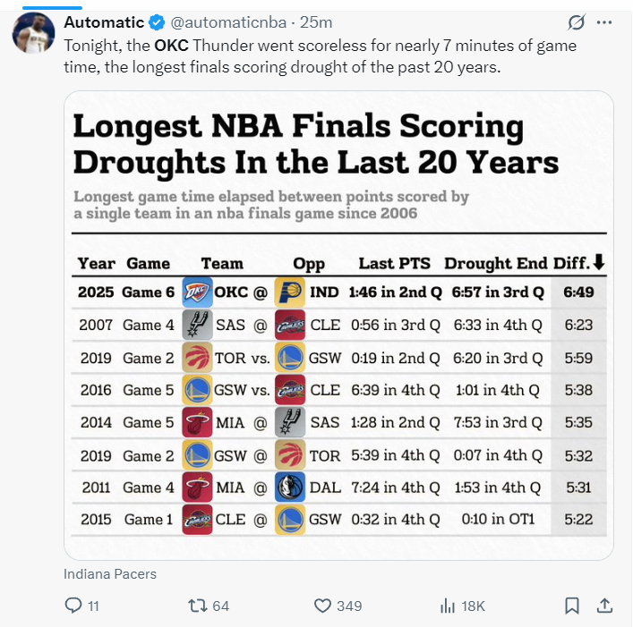 2.雷霆在第二节还剩1分46秒-第三节还剩6分57秒接近7分钟里1分没得是过去20年总决赛最长;