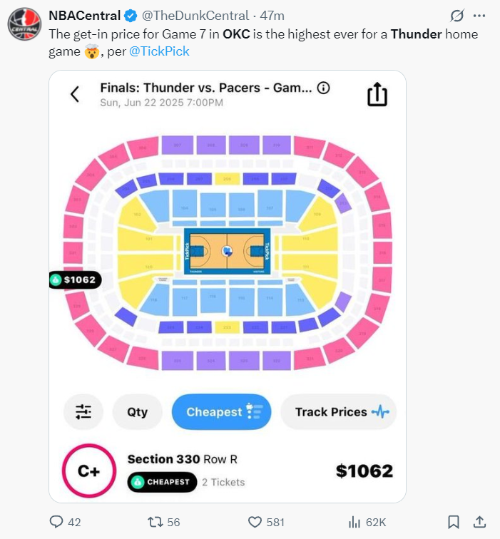 随着G6的失利,雷霆队抢七主场最便宜的门票达到1062美元,这创造了雷霆队史新高纪录;