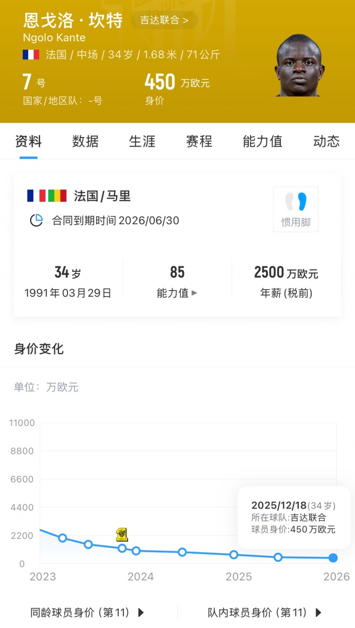 据公开数据显示,坎特在吉达联合的年薪为2500万欧,并且免税。降薪70%-80%意味着坎特的年薪将跌到500万欧-750万欧。